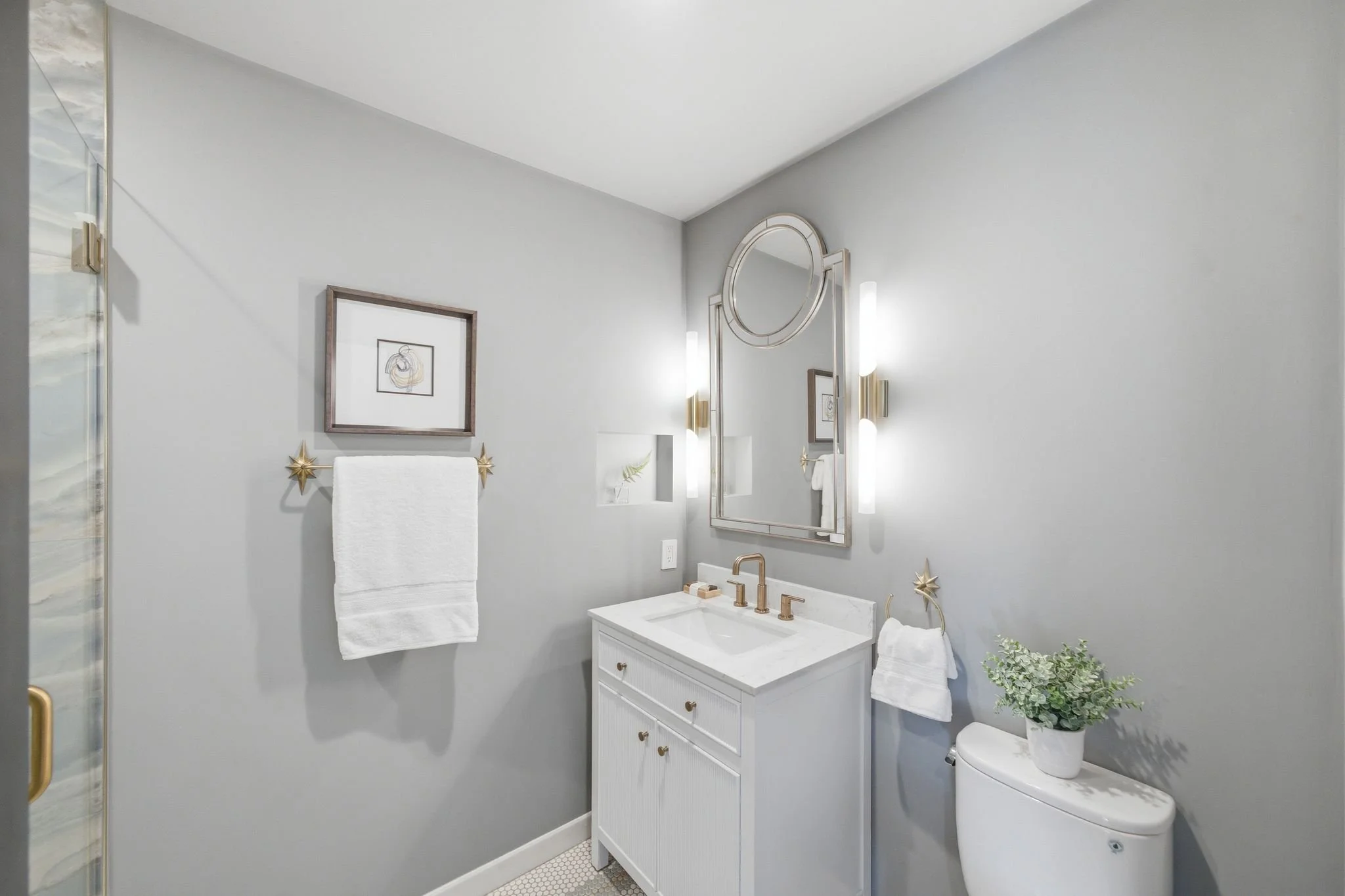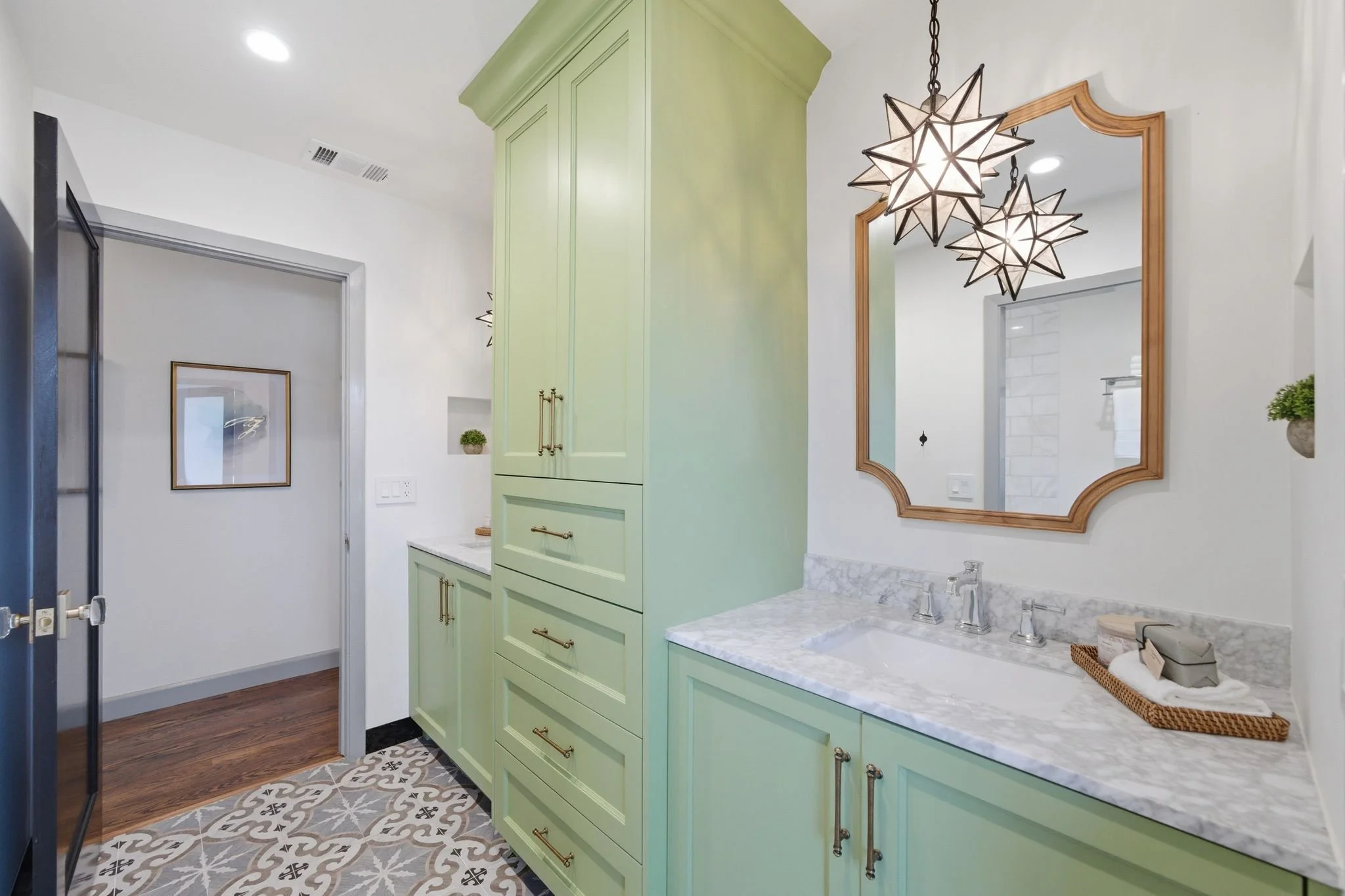 Overlooking the backyard, the luxurious primary suite is a peaceful retreat, complete with a spa-like bath and incredible walk-in closet outfitted with built-in organization. Two additional bedrooms share a darling updated hall bath. The fourth bedroom enjoys an en suite bath and provides flexibility for au pair, guests or a home office. Every detail of this home, including striking hardwood floors and custom cabinetry, has been carefully curated to evoke a modern style with practical functionality.